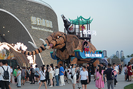 16米科技巨兽“机甲大象”霸气登场 七彩花车巡游解锁狂欢新体验这头科技巨兽“浑身是戏”:腿部前行走动,耳朵上下扇动,精细的皮肤纹理十分逼真,尤其是长长的鼻子灵活甩动,不时喷出“水柱”,引得小朋友在水下嬉戏。