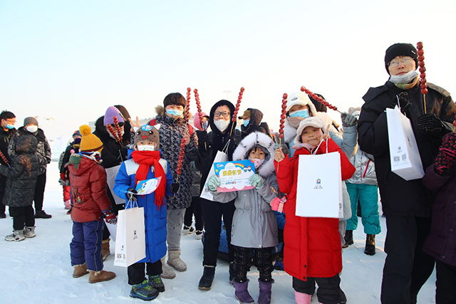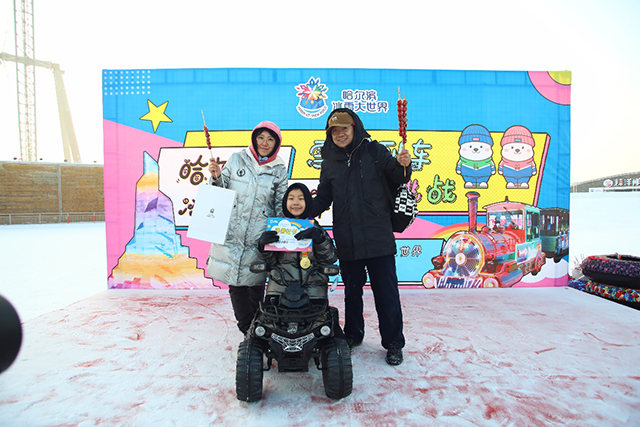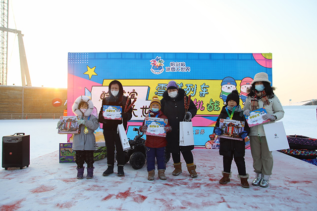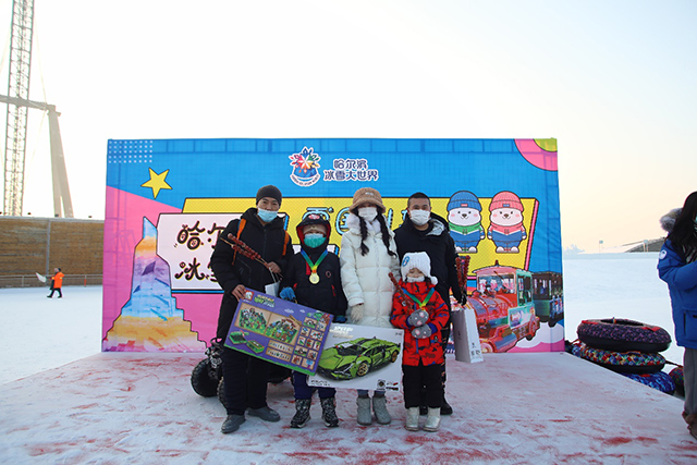 挑战环节全部结束后,哈尔滨冰雪大世界举行了简单而隆重的颁奖仪式,为获奖参与活动的家庭现场进行颁奖。颁奖仪式,家长们化身颁奖嘉宾,亲手为“冰雪小勇士”们颁奖。获得一、二、三等奖的小朋友从家长手中接过雪地越野机车、拼装模型、益智积木等奖品,其他没有获奖的小朋友也获得了冰雪大世界精心准备的纪念品,现场一派欢声笑语。