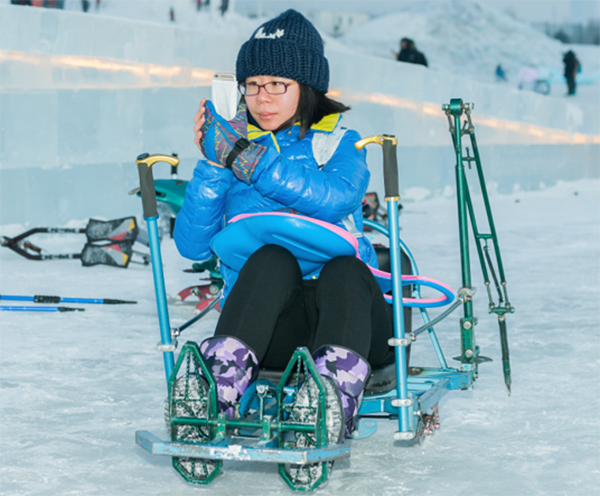 坐在撑橇之上,双脚分别踩踏于左右脚踏板上,双手各撑一只冰钎,通过双臂撑动可做向前、向左、向右以及回环和跳跃运动。