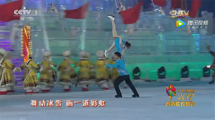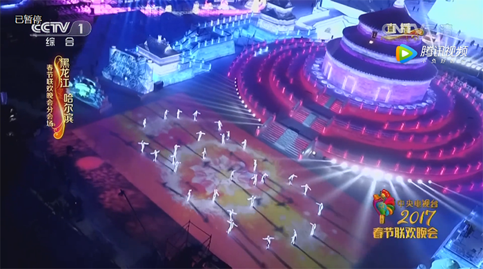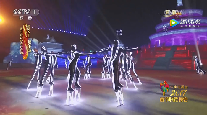 此次的画面呈现,是由央视制作团队运用虚拟摄像机把整个冰城的天空做成极光效果,国际花样滑冰顶级高手和黑龙江省杂技团高跷演员等如梦似幻的极光中,共同演绎冰上梦幻秀。