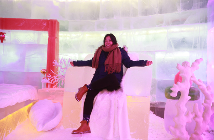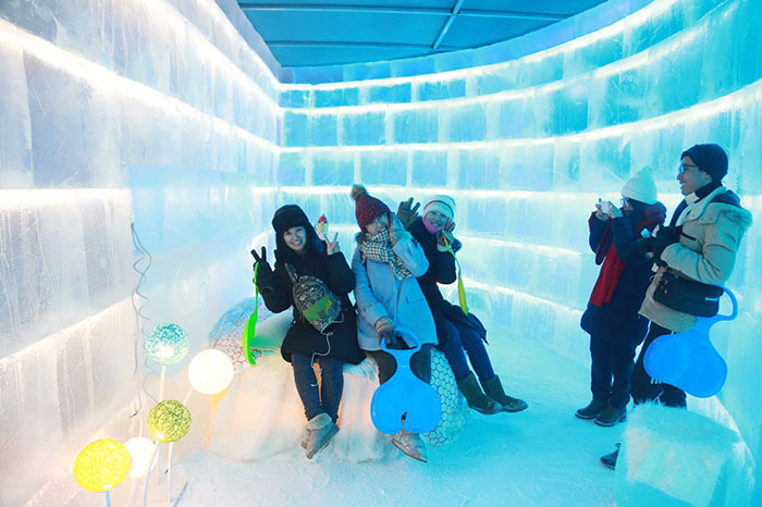 冰雪大世界联合聚划算共同打造了国内第一家冰雪主题酒店引来了大批游客参观。酒店命名为“Ju For Love”聚爱冰雪主题酒店,共分为聚梦、聚爱和聚愿三个造型前卫的主题房间。每个房间全部为冰雪打造:冰做的床、冰做的沙发、冰做的电视等全部是冰雕建筑,冰晶剔透,让人叹为观止!