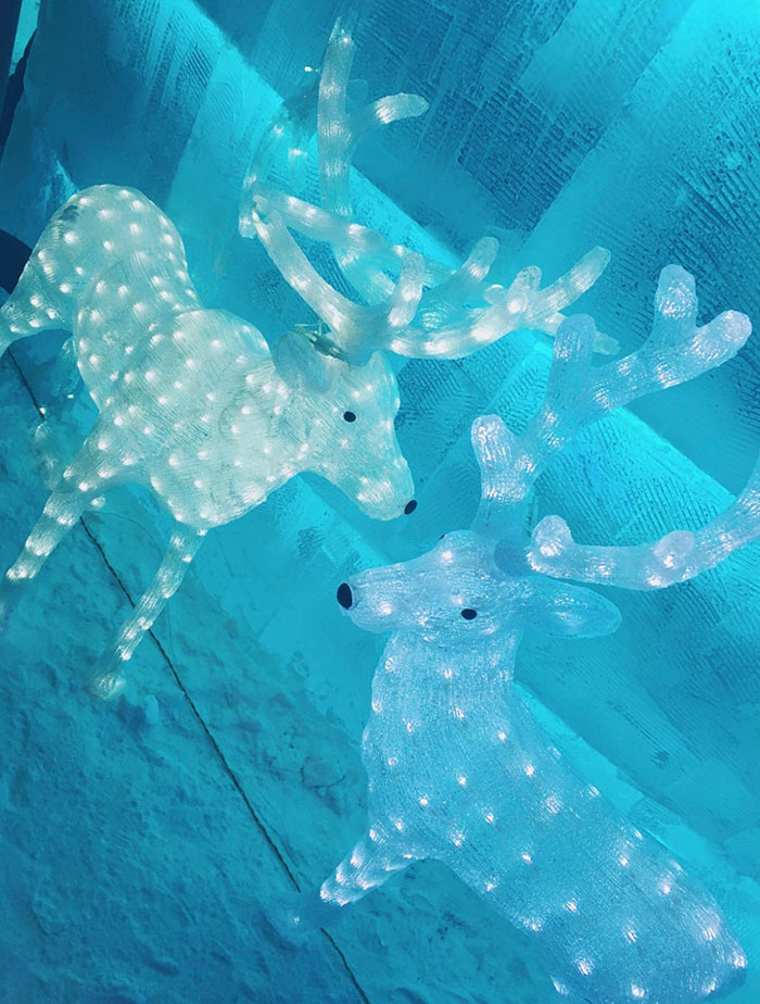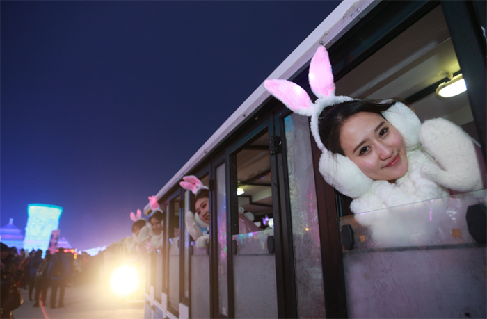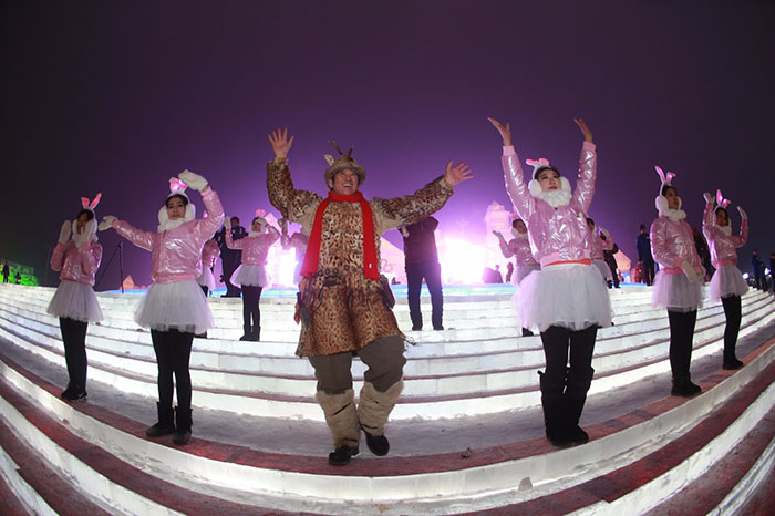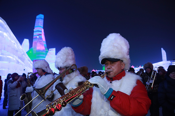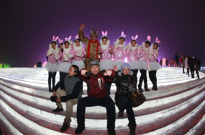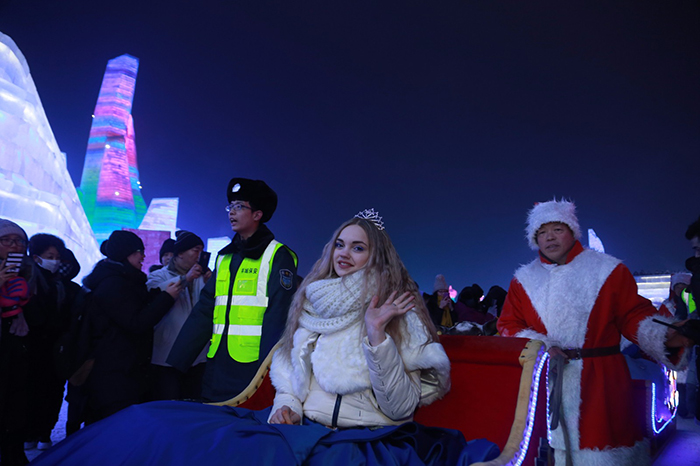 冰雪大世界每年跨年的保留项目冰雪巡游,在2016年12月31日23点10分,随着哈市老街乐队29名鼓乐手的吹拉弹唱开始,正式上演。韵味十足的乐队表演,十只可爱的驯鹿拉着美丽的异国美少女,吸引了众多游客争相拍照。