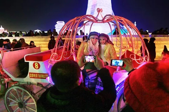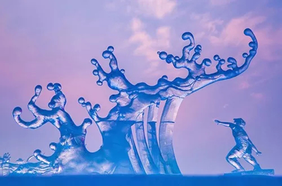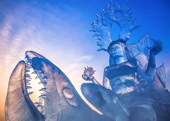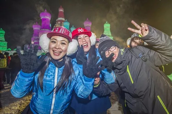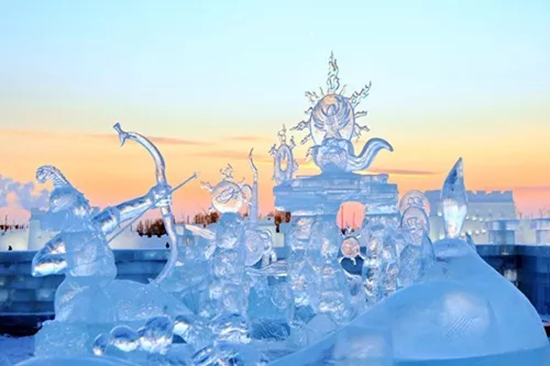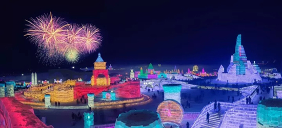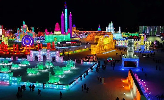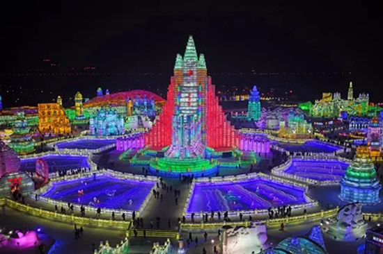 哈尔滨冰雪大世界构建了近百个大、中型冰雕雪塑景观。