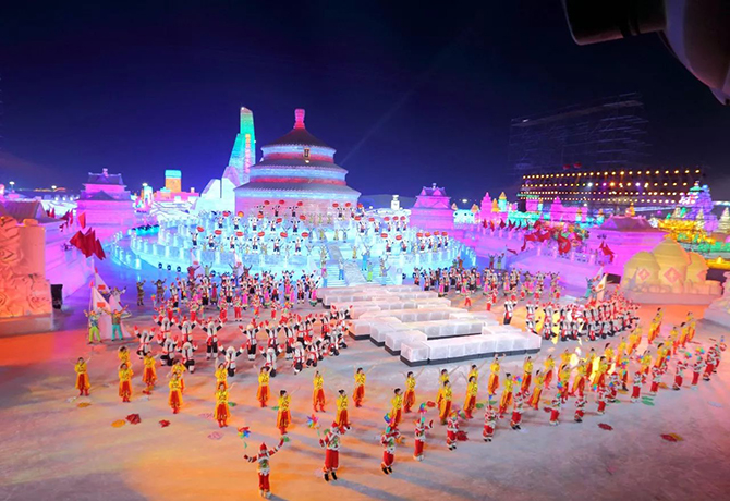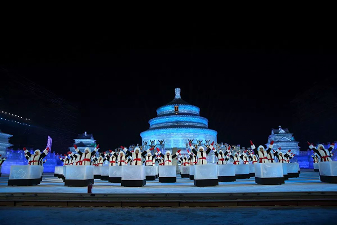 第十九届哈尔滨冰雪大世界重现了春晚冰雪会场的场景,