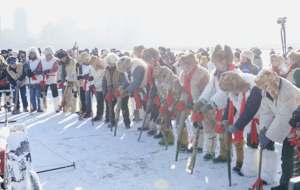采冰节之日,恰逢农历大雪之节气。届时,身着东北传统服饰的采冰汉子们喊着响亮的口号,在冰封的松花江江面上,上演一场精彩纷呈的古老仪式,将传统文化与现代文化的碰撞渲染到极致。