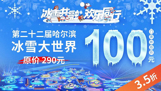 第二十二届哈尔滨冰雪大世界门票价格将在原价290元的基础上进行3.5折销售,门票惠民价100元。以三分之一的价格,带给游客三倍的快乐!