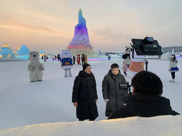 此外,位于冰雪大世界冰雪演播室的主持人和嘉宾,在连线中还向大家介绍了黑龙江的冰雪经济发展,说到哈尔滨是中国冰雪旅游的发源地,如今“冷资源”变成了“热产业”,带动了当地的经济发展。而且为了助力冬奥会,黑龙江的艺术家们利用10天的时间雕刻完成冰雕作品——北京冬奥会吉祥物“冰墩墩”,作品跋涉1300多公里,已抵达本届冬奥会三大赛区之一的延庆赛区。