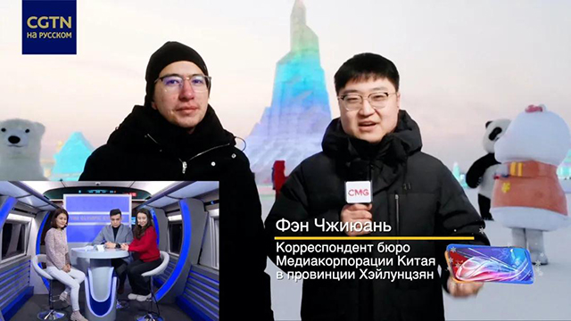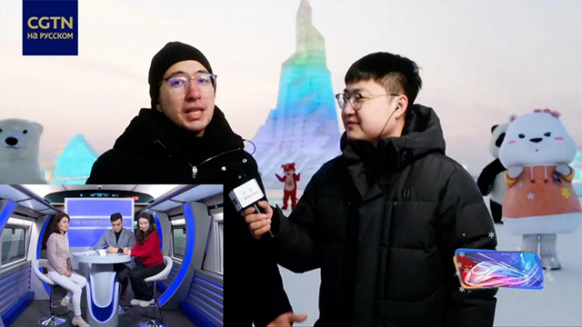 ▲总台黑龙江总站记者冯志远和俄罗斯嘉宾罗曼在演播室外准备连线