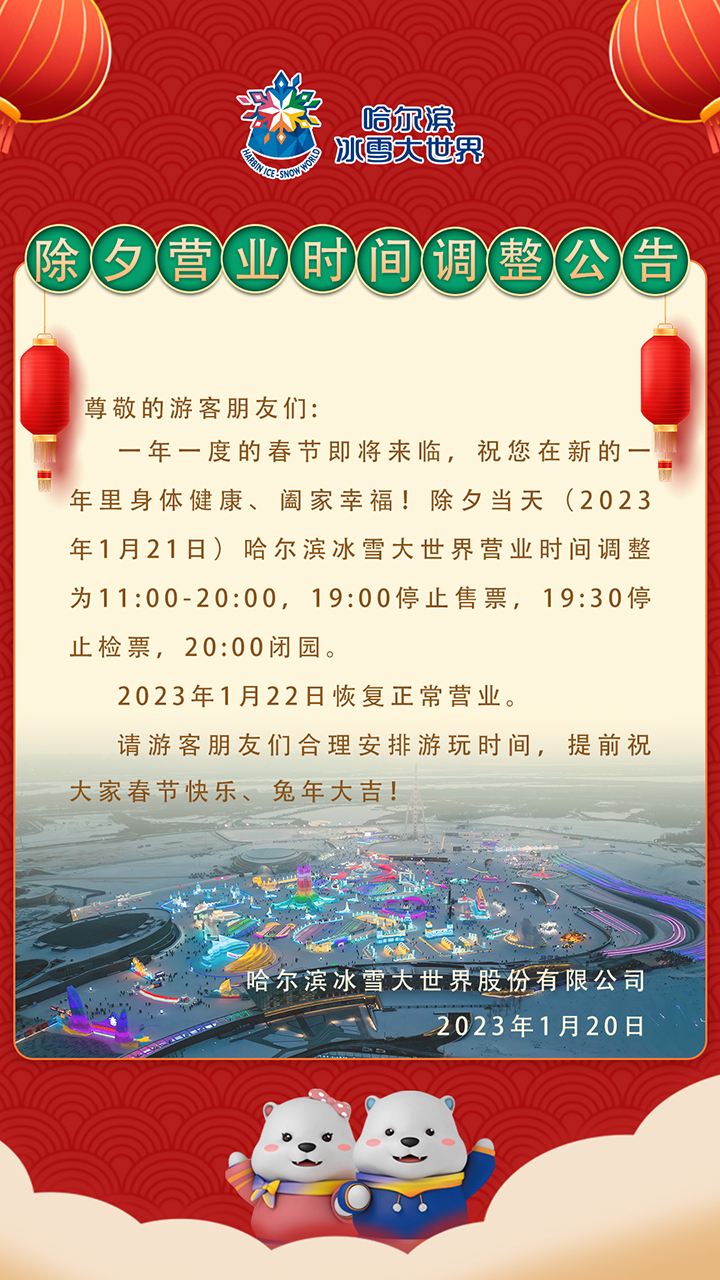 关于哈尔滨冰雪大世界除夕当天营业时间调整的公告