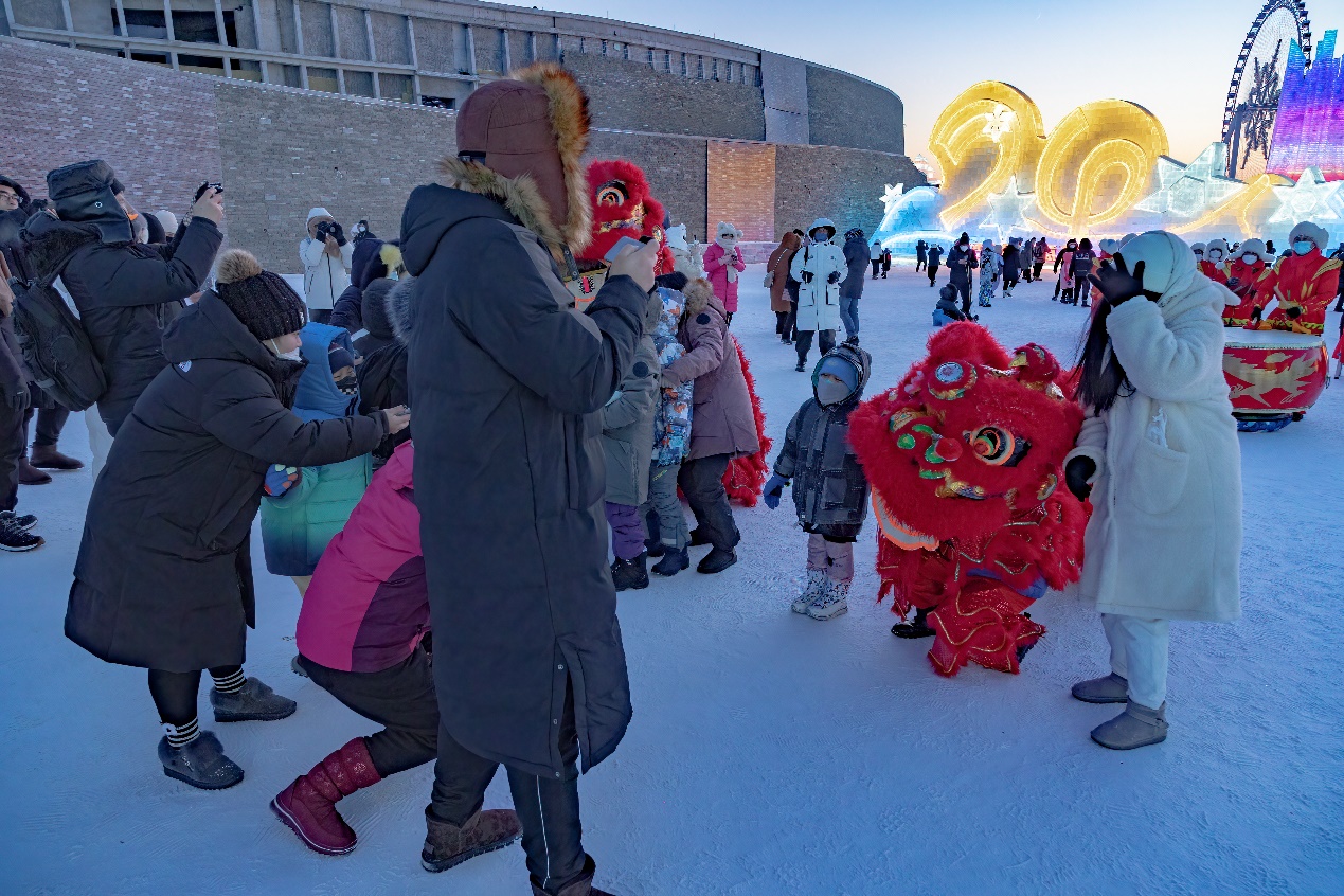 元宵节当天,哈尔滨冰雪大世界为游客朋友精心准备了舞龙表演,寓意吉祥如意、幸福安康。舞龙进入人群中间表演,让游客近距离感受东北民俗。