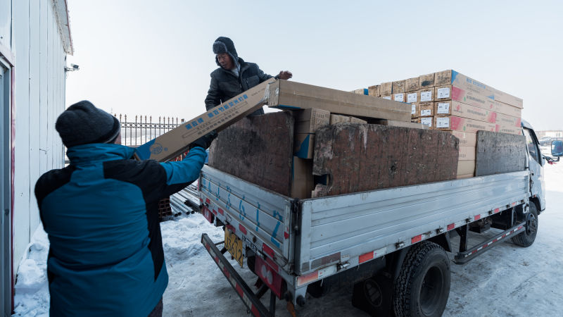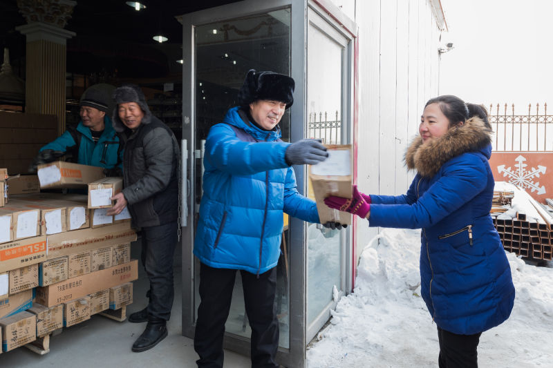 (哈尔滨冰雪大世界副总经理王增钰向乐业镇代表赠送日光灯管)