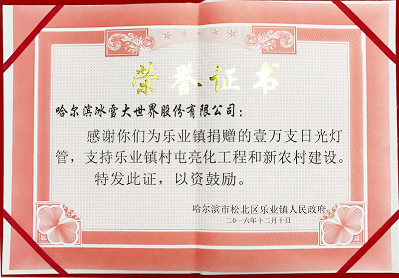 为支持新农村建设,彰显企业社会责任。近日,哈尔滨冰雪大世界向我市松北区乐业镇政府无偿提供了10000支日光灯管,用于支援乐业镇的新农村改造亮化工程。