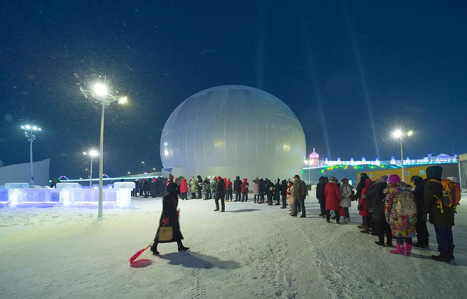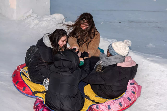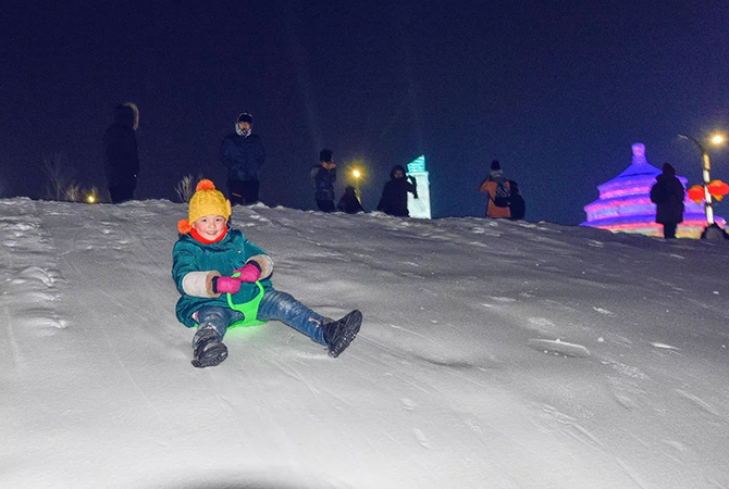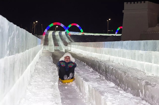超级冰滑梯是每年排队的“最热”区域。特别提示一下,大滑梯山顶出发点是拍摄园区全景最适合的地方,大家千万不要忘了拍照哦~